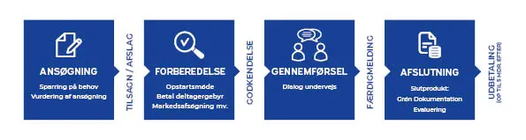 Læs mere om hvordan du markedsafsøger - Det er kun muligt at søge om ét tilskud ad gangen. Derfor er det kun muligt med ét aktivt forløb ad gangen.