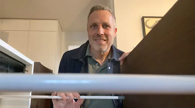 Michael står i en lejlighed på 1. sal i Silkeborg, hvor familien, der bor der, har bedt om hans hjælp til at få det køkken, de drømmer om.