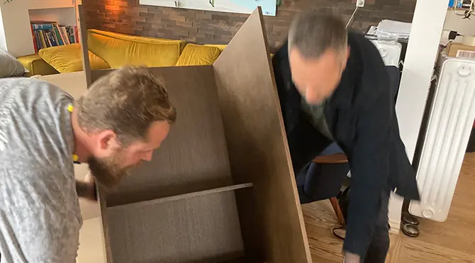 Kunden ønsker nye elementer i sit eksisterende køkken, som Michael og håndværkeren pakker ud. Foto: Natascha Kalika Østergaard